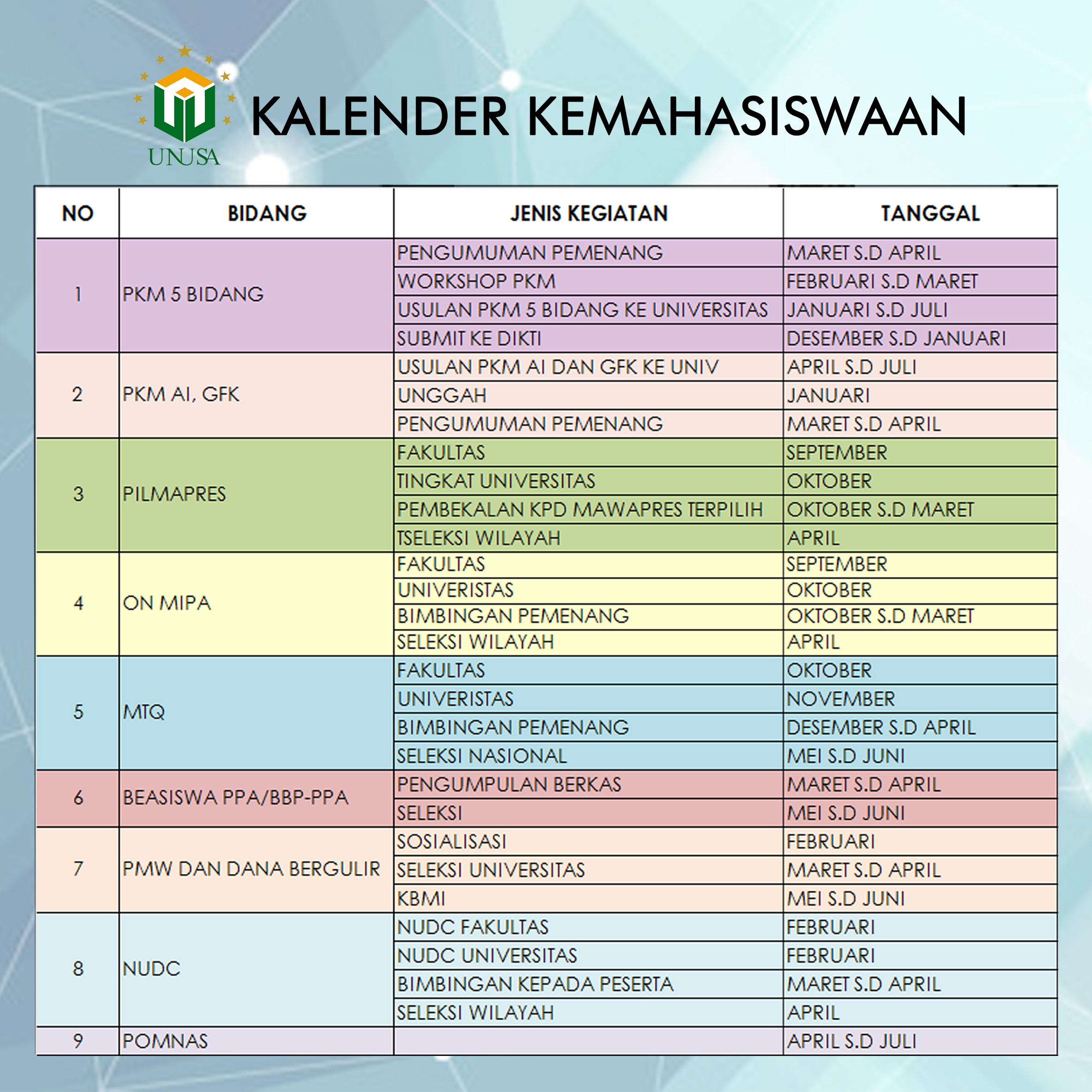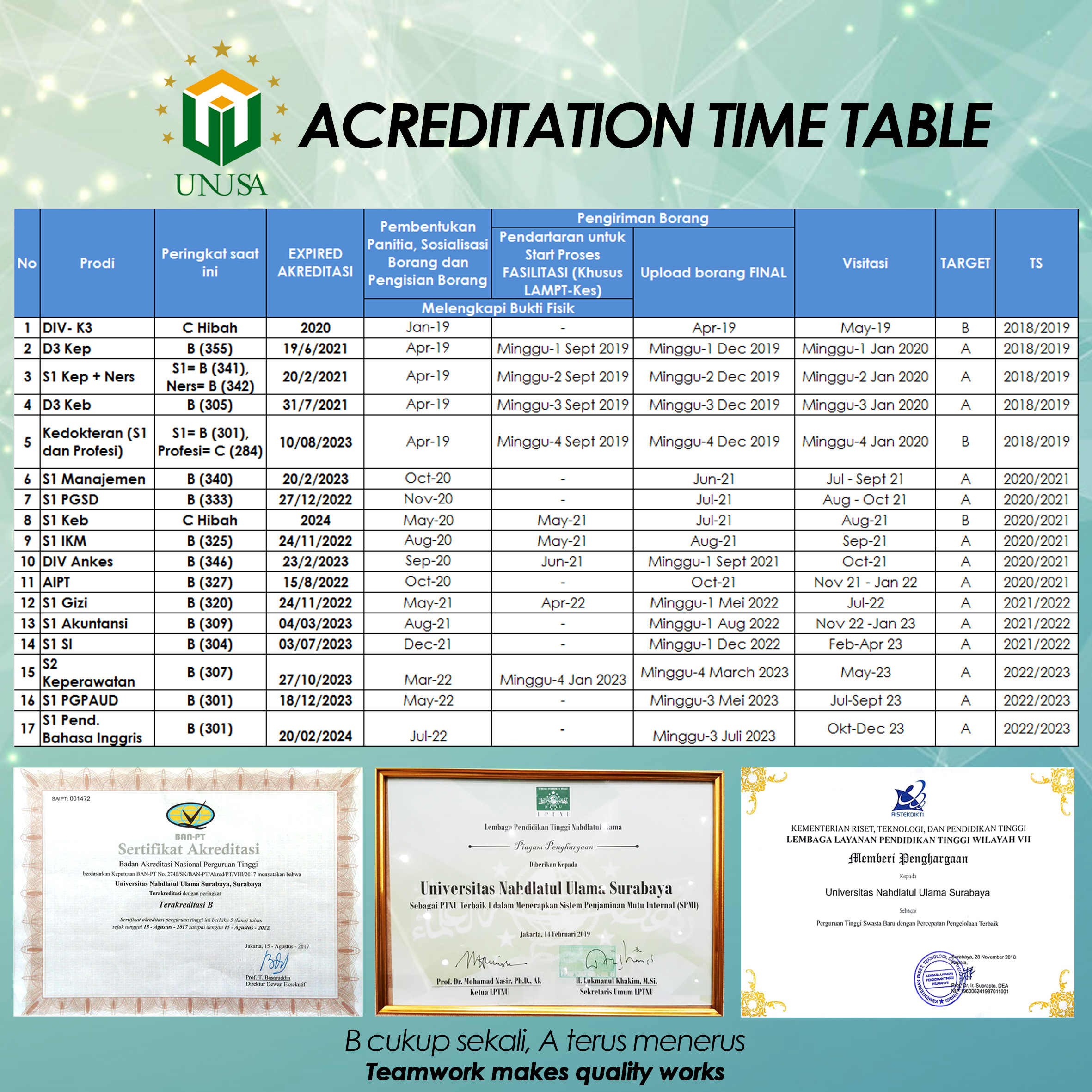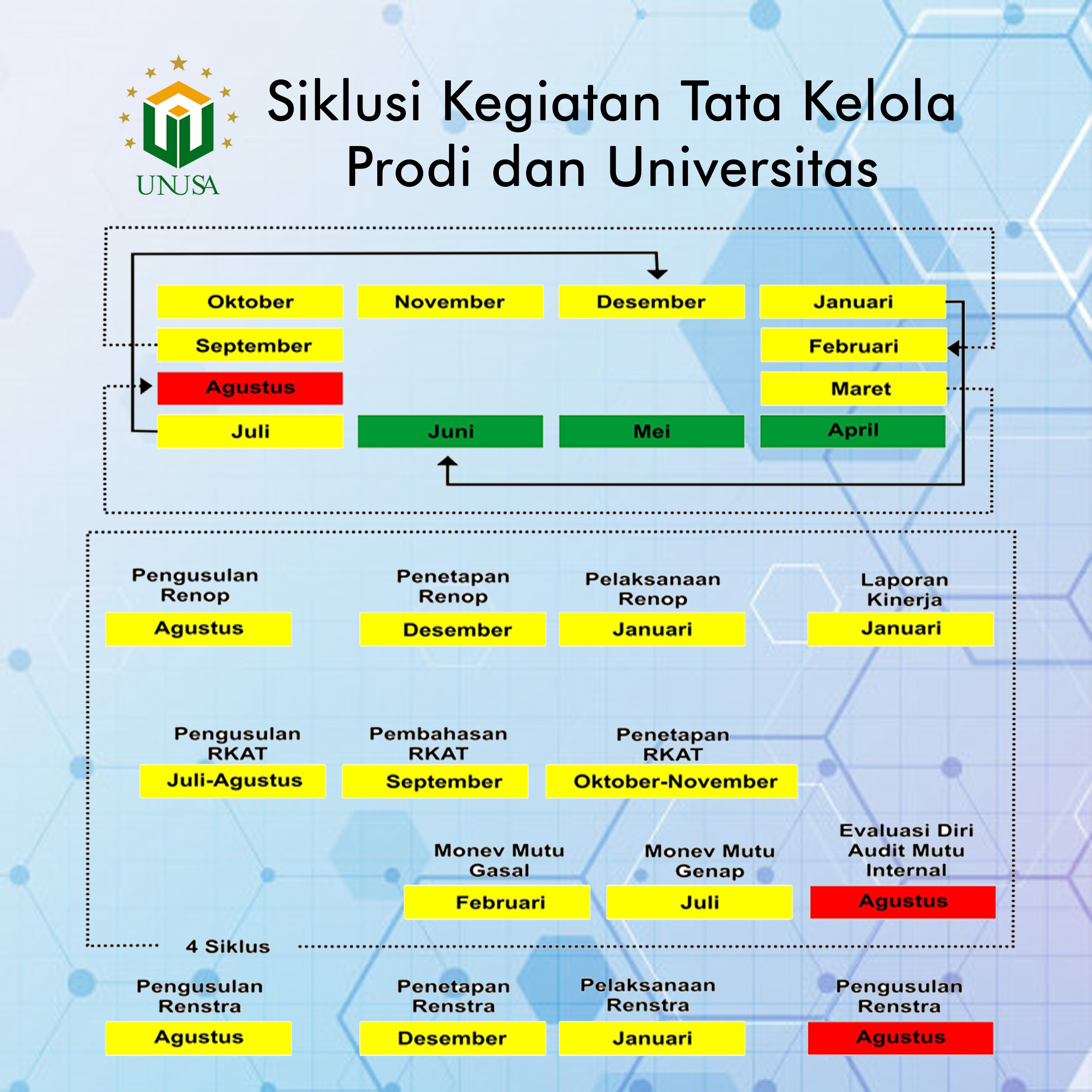Sebagai usaha meningkatkan manajemen utu Universitas Nahdlatul ulama dan men-cover up segala kegiatan yang harus dilakukan oleh Unusa setiap tahunnya, maka kalender tata kelola ini dibuat. Adapun Kalender tersebut adalah sebagai berikut: