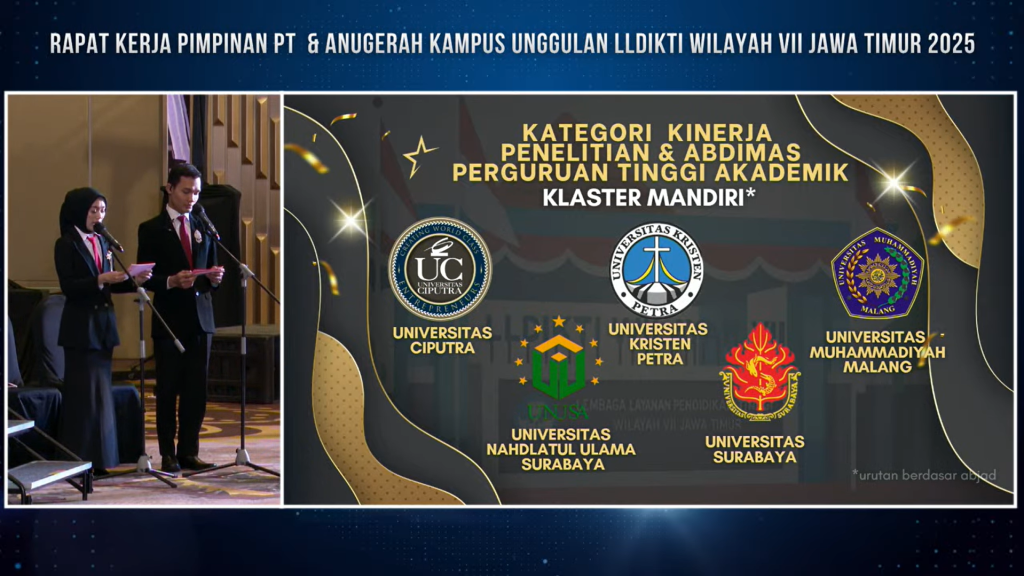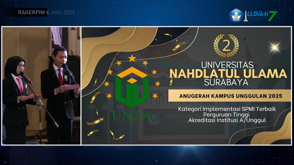 Malang, 31 Oktober 2025 β Universitas Nahdlatul Ulama Surabaya (Unusa) kembali menorehkan prestasi membanggakan pada ajang Rapat Kerja Kepala LLDIKTI Se-Indonesia dan Pimpinan Perguruan Tinggi di Lingkungan LLDIKTI Wilayah VII yang digelar di Hotel Grand Mercure Malang, Jumat (31/10).